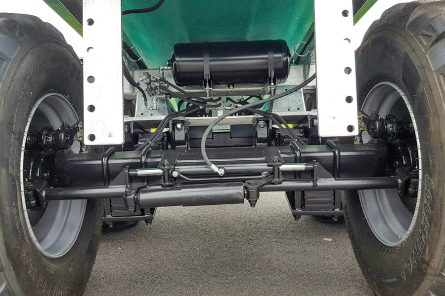 Med 21 tonns svingbar boggi med bladfjæring følger det bakre hjulsettet med i stedet for å rive. Svingen kjøres i flyt og følger kjøreretningen av seg selv. Ved rygging tilføres oljetrykk, og boggien sentreres.