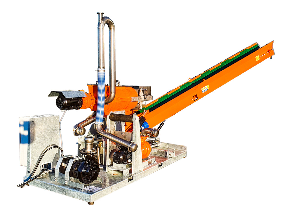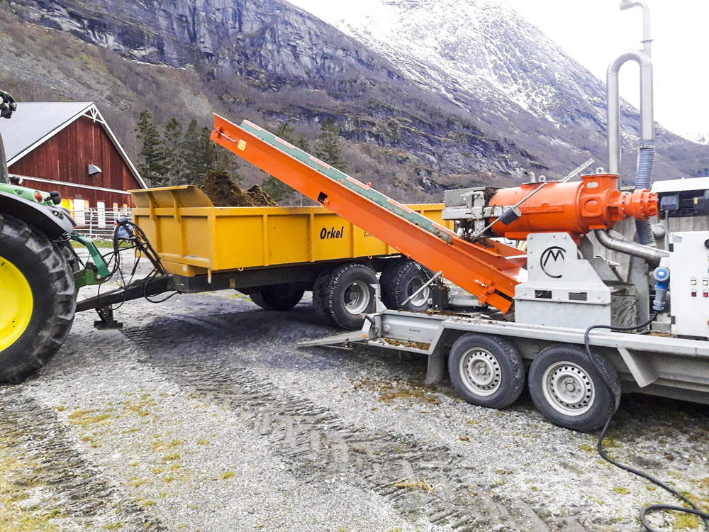 Sammen med Cri-man har MOI utviklet en mobil separatorenhet. Denne leveres med transportbånd og styreskap. Enheten kan også leveres med henger- understell (som vist på bildet). MOI monterer også på sin vanntank, som gjør at enheten ikke trenger en ytterligere matepumpe/dykkpumpe. I tanken vil man alltid ha gjødsel tilgjengelig for pumpa ved start/stopp.