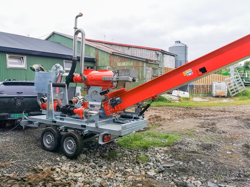Sammen med Cri-man har MOI utviklet en mobil separatorenhet. Denne leveres med transportbånd og styreskap. Enheten kan også leveres med henger- understell (som vist på bildet). MOI monterer også på sin vanntank, som gjør at enheten ikke trenger en ytterligere matepumpe/dykkpumpe. I tanken vil man alltid ha gjødsel tilgjengelig for pumpa ved start/stopp.